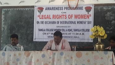 On the ocassion of International Womens' Day an awareness programme on 'Legal Rights of Women' was organized at Tangla College conference hall in joint collaboration of Tangla Women Cell and IQAC cell today.Women cell convenor Sabita Mazumdar Kalita,Principal Dr.Prasen Daimari spoke on the ocassion. The programme was presided over by Chandan Baruah co-ordinator IQAC cell. The programme was attended by Rashmi Rekha Devi and Minati Deka advocates of Mangaldai bar association as guest speakers. Various attrocities meted on women,female fortitude ,dowry,domestic violence and their laws were discussed.