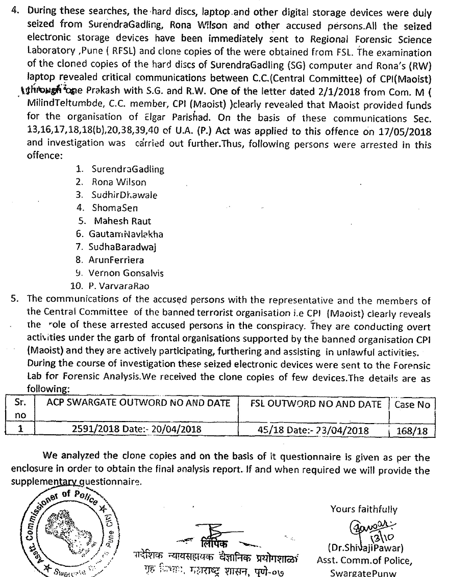 আৰক্ষীৰ অভিযোগপত্ৰৰ নিৰ্দিষ্ট অনুচ্ছেদত উল্লেখ কৰা হৈছে: "জব্দ কৰা চিঠিপত্ৰৰ পৰা উল্লেখ কৰা হৈছে যে পিছপৰা শ্ৰেণীৰ চিন্তাধাৰা এতিয়া বিজেপি আৰু আৰ এছ এছৰ ব্ৰাহ্মণ-কেন্দ্ৰিক কাৰ্যসূচীৰ বিপৰীতে গৈছে। এইটো তেওঁলোকৰ প্ৰয়াস যে তেওঁলোকৰ মনত এই ধৰণৰ অস্থিৰতাক মূলধন হিচাপে ব্যৱহাৰ কৰিব লাগে তেওঁলোকক বৃহৎ পৰিমাণে সংগঠিত কৰিব লাগে আৰু ইয়াৰ সুবিধা গ্ৰহণ কৰি বৃহৎ পৰিমাণে বিশৃংখল পৰিস্থিতিৰ সৃষ্টি হয়।"