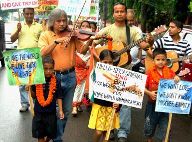 A protest rally was organized today from the gates of Guwahati Press Club to create awareness for ban against toy weapons and violent Video games. It assumes special attention and urgency in the perspective of attempts by various militant outfits abducting kids and children and training them to be future extremists cadres. Especially in the North Eastern State of India extremists groups have been reported forming children's force which has given alarming rise to abduction of children.