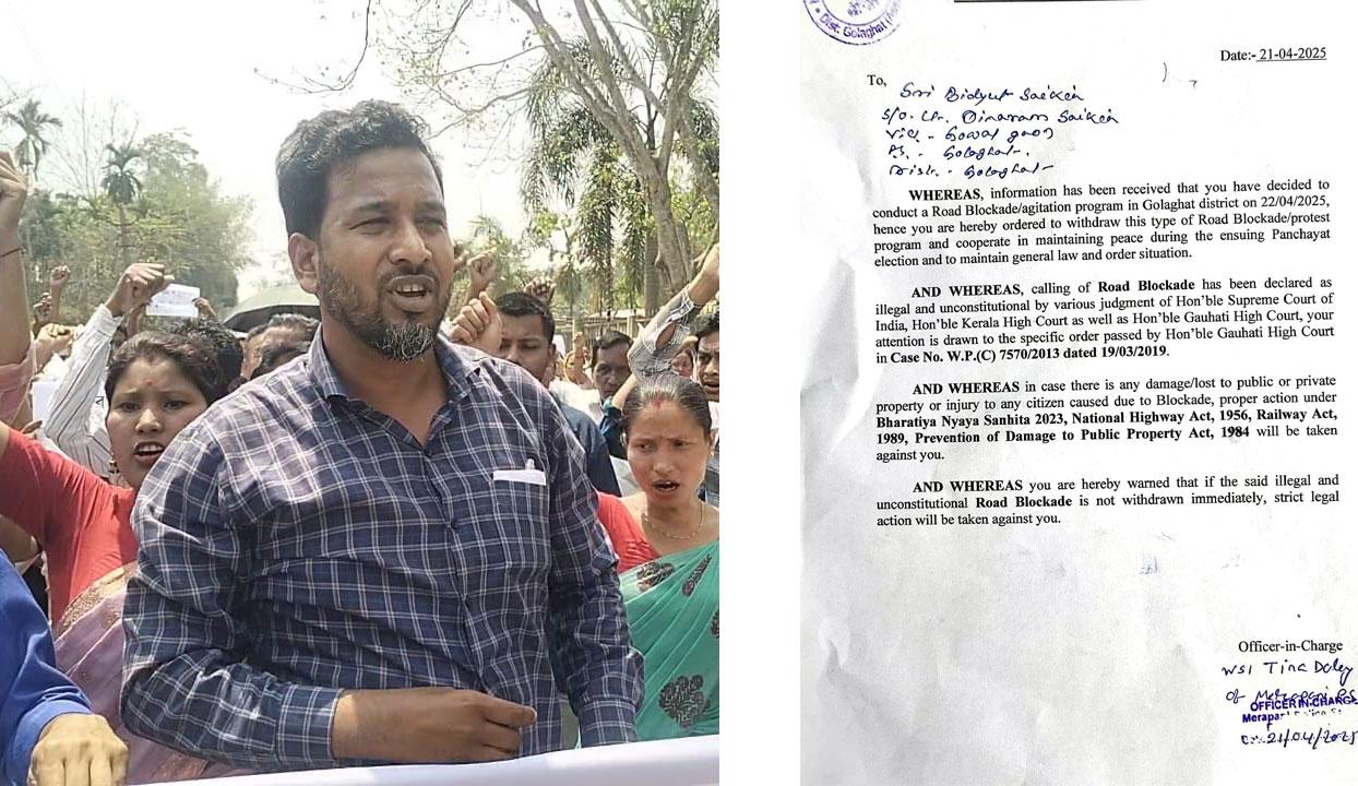 The notice, served under Sections 168 and 171 of the Bharatiya Nyaya Sanhita (BNSS) 2023, directs Saikia to immediately withdraw the agitation and cooperate in maintaining law and order during the ongoing Panchayat elections. It cites rulings by the Supreme Court, Kerala High Court, and Gauhati High Court—including a 2019 Gauhati High Court order (W.P.(C) 7570/2013)—declaring road blockades illegal and unconstitutional.