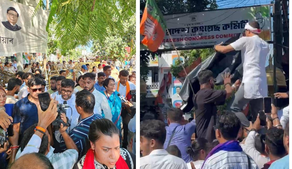 BJP agitators broke barricades set up by police and tore down Congress banners and posters displayed outside Rajiv Bhawan. The banners included images of key Congress figures such as state Congress president Gaurav Gogoi, opposition leader Debabrata Saikia, and Assam Pradesh Mahila Congress chief Meera Barthakur. In front of media cameras, BJP members were seen attempting to forcibly enter the Congress office, leading to clashes with security personnel.