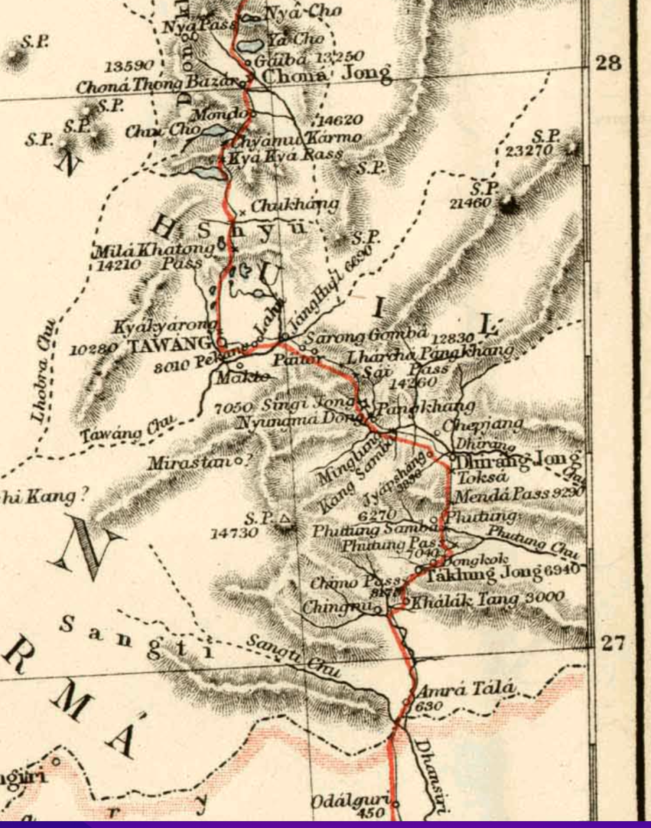 Following the Anglo-Bhutan (Dooar) War of 1864–65, Major MacGregor surveyed this path. It took roughly a month to traverse the entire route (see Map ‘A’). This was the busiest and most popular corridor for travel and trade, through which even the influence of Tibetan Buddhism spread.
