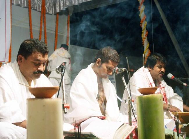 Noted singers of Assam, Krishnamoni Nath, Vidyasagar and Biman Baruah reciting Bhagawad at a...