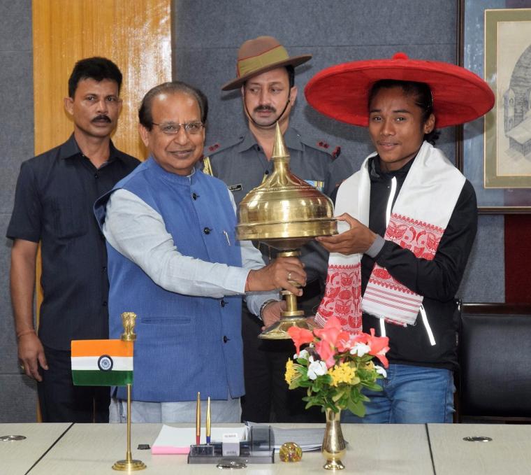 Fresh from her record breaking feat in the 58th National Inter-State Athletics Championship, at Indira Gandhi Athletics Stadium here at Sarusajai, Hima won 2 gold medals in 200 metre and 400 metre sprint. I am happy to have run my personal best at my home track and I am privileged to have been felicitated by the Governor. It is special," expressed Hima.