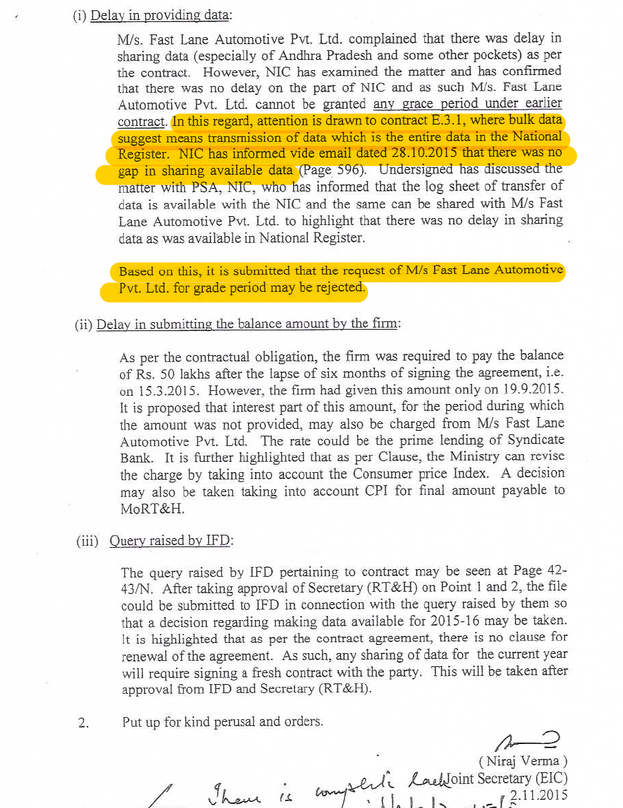 Bulk Data Sharing contract is signed between the Ministry and Fast Lane. There is no auction for discovering market price of the data and Fast Lane gets exclusive access to public information. NIC is bypassed. |