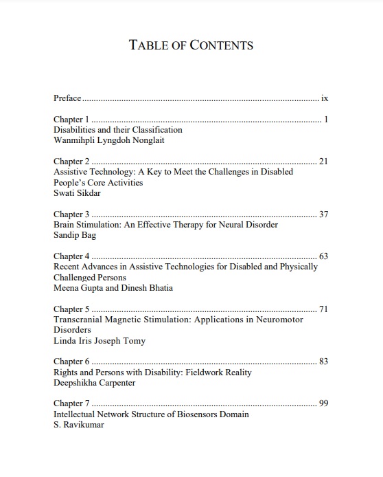 The advent of communication technologies and advanced intervention tools promise to revolutionize the lives of people by removing obstacles and barriers and expanding the scope of access to even the disabled population. Technological advancements can help in social inclusion and accessibility to new technological interventions that are robust and flexible based on their needs. The need of the hour is to provide technological solutions with multidisciplinary approach to resolve the problems and improve the quality of life of disabled, physically challenged and elderly population with focused technological interventions that aim to provide autonomy and independence to persons with disability through holistic development by creating enabling environment for their empowerment through use of such modern scientific technological interventions. Despite its existence, not many books are available in this area and it would be one of its kind which would incorporate knowledge and expertise from professionals working globally in the field for the past several years to help establish the technology. It will provide insight into the budding of researchers and students to explore the field further.
