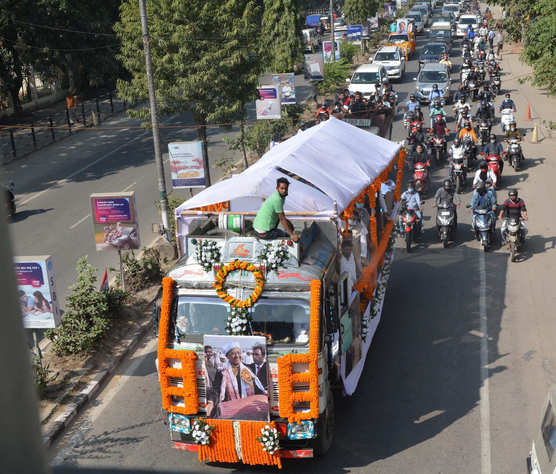 Thousands of his fans kept waiting to see the last ride of the Peoples 'leader on both sides of the busy GS Road. Many of his fans threw petals to the vehicles as it carried the body inside a coffin.