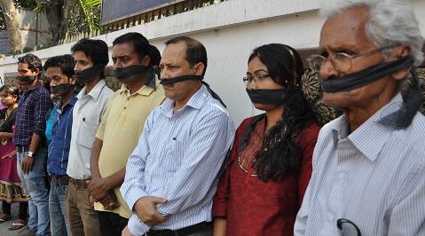 Journalist and non-journalist media employees engaged with newspapers and news channels in Guwahati have demonstrated their angers today in front of Guwahati Press Club against the management of Sangbad Lahari, a Bengali daily newspaper simultaneously published from Guwahati & Shillong for its sudden closure notice rendering 100 employees jobless. The participants covered their mouths with black clasps demanding an immediate withdrawal of the closure notice issued by Shillong Times Pvt Ltd, Meghalaya three days back. The agitators also urged Tarun Gogoi, chief minister of Assam and Dr Mukul Sangma, chief minister of Meghalaya to pursue with the concerned management to continue its publication.