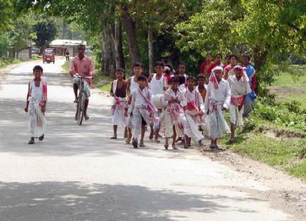 Group of kids in Assamese traditional attire to perform husori at the neighborhood on the occasion Rongali Bihu festival at Bihpuria, Lakhimpur on 17th April 2008.