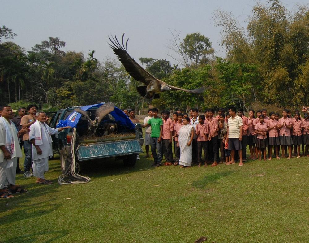 “It is a moment of mixed feeling. We are happy to treat and revive these nine individuals, including the critically endangered white-rumped and slender billed vultures, but are equally concerned about the safety of these individuals once they are released back in to the wild,” said Dr Bhaskar Choudhury, Regional Head and Head Veterinarian The conservationist like Joynal Abedin (Benu) of Dibru Saikhowa Conservation Society , Gunadhar Konwar, Honorary Wildlife Warden,Raj Sonowal of Evergreen Foundation along with senior villagers Dimbeswar Sonowal, Minati Sonowal addressed the gathering on the need of vulture conservation. Notably, Biswajit Sonowal, a village youth and his friends helped in rescuing the sick birds from the carcass poisoning incident site on 4th March 2015, which has been appreciated by the forest officials and conservationists.