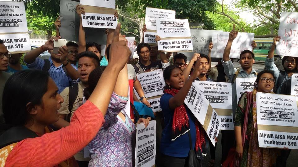 Women's and students' groups hold a protest at Assam Bhawan today against the rape of three women in Karbi Anglong, Assam, by Army personnel. The protest was joined by Pooberun, All India Students' Association (AISA), All India Progressive Women's Association (AIPWA), Student Youth Council (SYC), North East Forum for International Solidarity and Manipur Students' Association of Delhi (MSAD). On 6 April 2015, around eight jawans carried off a 15-year old girl into the forest; when her mother and another woman rushed to rescue her, the jawans raped all three.