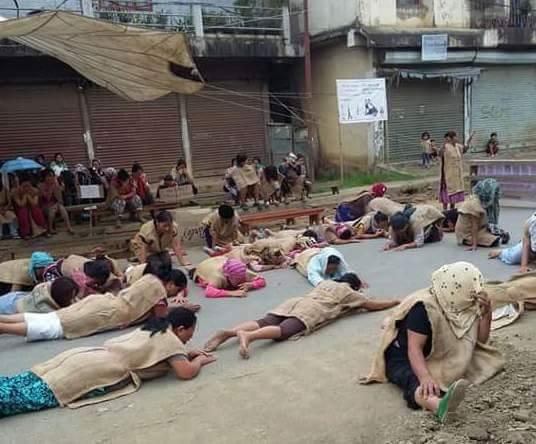 In an unprecedented move for sustainable peace in Manipur, women in large number started lying on a bare road in Churachandpur, Manipur donning sack on Thursday. They lost 8 people in the recent orgy of violence which erupted after the assembly passed three controversial bills. Notably, women in this restive north eastern state have been raising voices against injustice, rights violations and all adds for the last many years.