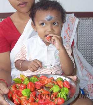 A 17-month-old toddler in Assam happily devours the locally available scorching Bhut Jolokia, recognized by the Guinness World Records as the hottest chilli on earth. The parents of Jayanta Lahan of Romai village in Dibrugarh say the child gleefully munches a handful of Bhut Jolokia, the world's hottest chilli, without batting an eyelid. 'Yesterday (Monday), he ate some 50 Bhut Jolokias in about three to four hours without showing any signs of tears or burning sensation in his stomach,' the child's father Ritul| The child, nicknamed Johnny, became hooked onto chillies when he was just about eight-months-old.