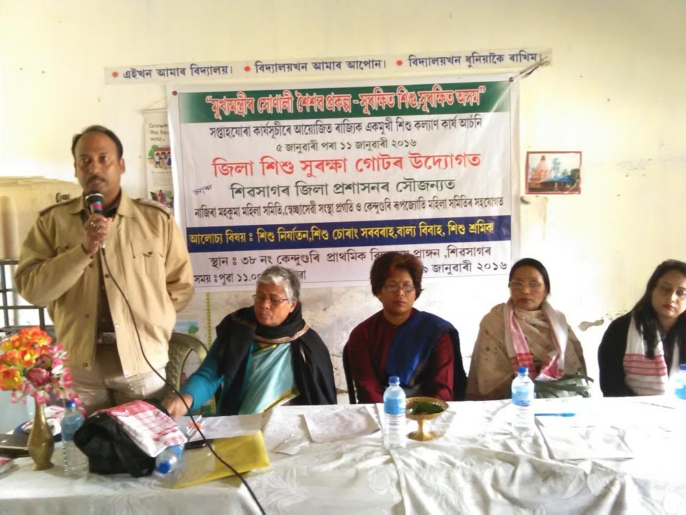 A meeting on child protection was held at at Kenduri LP School, Simaluguri on Saturday. Social worker Manika Saikia, child protection officer of Sivasagar district Dibya Deori, SDPO of Nazira Rajendra Uzza, president of Nazira Mahkuma Mahila Spmmittee Dibyajyoti Gohain, Secretary of the NGO PRAGATI Nirjumoni gogoi, Secretary of the freelance journalist association of Nazira Dilip Hazarika took part in the programme. The programme was organised under the "Mukhya mamtrir Sunali Soishab Prakalpa - Surokhayat sishu, surokhayata Axom yojona" by Nazira Mohkuma Mahila Sommittee and the Pragati.
