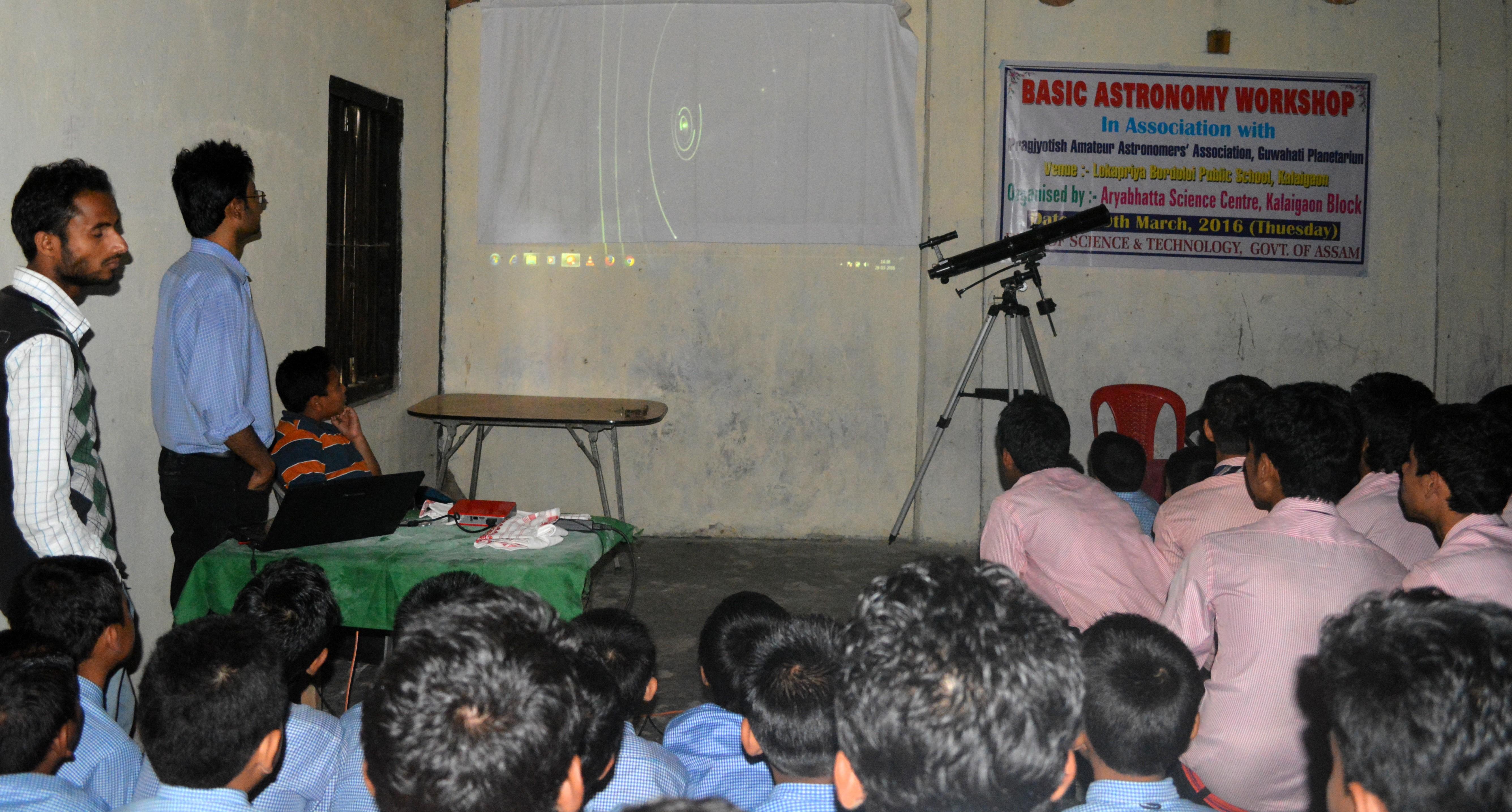 Aryabhatta Science Centre,Kalaigaon under ASTEC (Assam Science Technology and Environment Council)organized two workshops on basic astronomy at Kalaigaon and Bananguri in Udalguri district on March 29.The two astronomy workshop were sponsored by PRAG (Pragjyotish Amateur Astronomers' Association,Guwahati Planetarium under department of Science & Technology,Assam government.The first workshop on basic astronomy was held at Bananguri HS at 11 am.The school has been situated in a remote village in Udalguri district. Hundreds of enthusiasts students and teachers attended the workshop.Manas Pratim Sarma,Asst.Secy of PRAG conducted the technical session which was inaugurated by Khagen Nath,Headmaster of Bananguri HS.The topics covered were-basic astronomy,history and evolution of space, blind believe and superstition etc.The other block lavel workshop on basic astronomy was held at Aryabhatta Science Centre at Lokapriya Bordoloi Public School, Kalaigaon at 2 pm.Students and teachers of six high schools namely- Kalaigaon Girls HS,Lokapriya Bordoloi Public School,Pride Academy,Ranthali HS,Bholabari HS, Chengapara HS and Kalaigaon Girls MVS participated in it. Here too the workshop was conducted by Manas Pratim Sarma of PRAG.He had interactive session with students while conducting the multimedia demonstration on- astronomical telescope,history and evolution of Solar System and planets,comets,asteroids,black hole,supernova, galaxies, expansion of the universe,dark energy and dark matter etc.The participants were given basic knowledge of telescope and how to handle telescope.Distinguished people namely-Jayanta Das,District Coordinator, ASC,Udalguri;senior journalist of Darrang and Udalguri Bhargab Kumar Das, Dhritishree Hazarika,Block Coordinator ASC,Kalaigaon;Binu Deka Saikia,Headmaster, Kalaigaon Girls HS; young scientist Upamanyoo Das,Basanta Deka,Head Master,LB Public School Kalaigaon etc attended the workshop.In the evening a Sky Observation programme was arranged where the participants were trained to see planets,stars,constellation of stars etc through sophisticated telescopes.