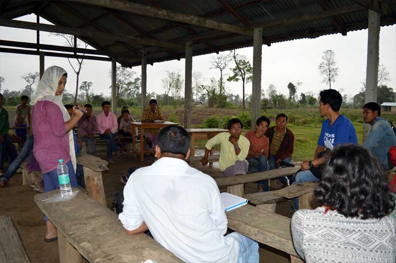 By the time we reached the village market in Laimuti it was late afternoon. The village headman Sukur Basumatary took us to an open school. Few fixed desk benches and a pair of wooden chair-table and a tinned roof hold up by not many concrete pillars were the only infrastructure in the school. However, name of the school Rwdwmkang which means ‘uprising’ in Bodo language actually points towards the aspiration of the villagers. More than 50 students are getting educated without any government support. The villagers collect money and other resources among themselves to pay the monthly salary of Rs. 1000/- to the teacher. Around 8000 people are living in 25 forest villages in Laimuti area without a single government school, no Anganwadi centre, no health facility, no source of drinking water or any other government services. In other words, they are still living right inside the forest, where there is no presence of government.