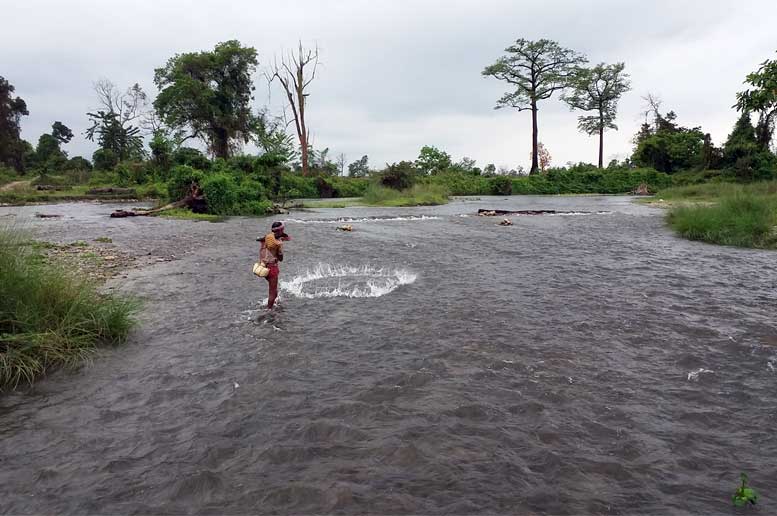 Three of my colleagues along with our local resource person Dan Narzary, we crossed the bamboo bridge over river Chapma a beautiful place around 10 kilometers from Runikhata under Chirang district of BTAD in Assam. River Champa is a narrow but powerful river as its water follows fast and during monsoon it becomes ferocious. A middle age man was hurling his fishing net near the bamboo bridge. The big trees in the upstream of the river made the scenario picturesque.