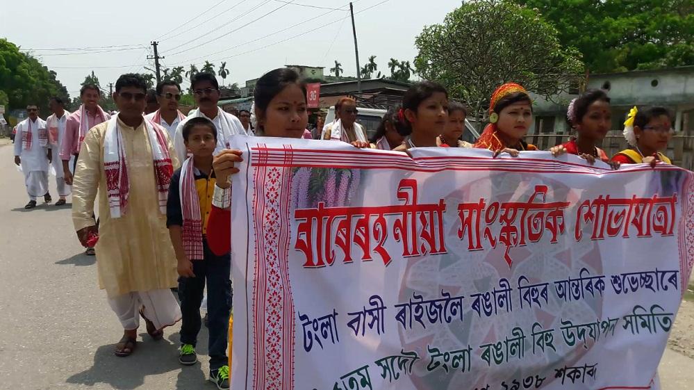As a part of the three-day programme for the celebration of Rongali Bihu. The first day celebration on Thursday marked with flag hoisting by the president of the celebration committee, of Xadou Tangla Rongali Bihu Xanmilani. Followimg which a colourful cultural procession reflecting various communities was also taken out from the Tangla H.S playground throughout the town. People of the town came out in unison to participate in the rally. Many other Bihu Xanmilans also joined in unison and took part in the cultural rally.