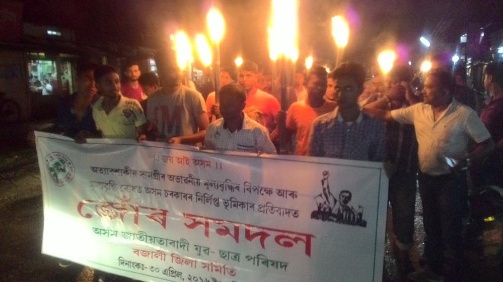 Asom Jatiyatabadi Yuba Chatra Parishad (AJYCP) took out a protest rally against prices hike of essential commodities at Pathsala on Saturday at around 7.30 in the evening. AJYCP members of Bajali district committee led by Secretary Bijan Bayan and Join Secretary Diganta Sarma took out the rally from their office to Pathsala Town Chariali.