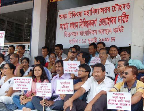 Journalists of Dibrugarh Staged a sit-in-demonstration protesting against the ban imposed by the Assam Medical College and Hospital authority on the entrance of the Journalists into the College premises for the last few days in Dibrugarh on15-07-08.