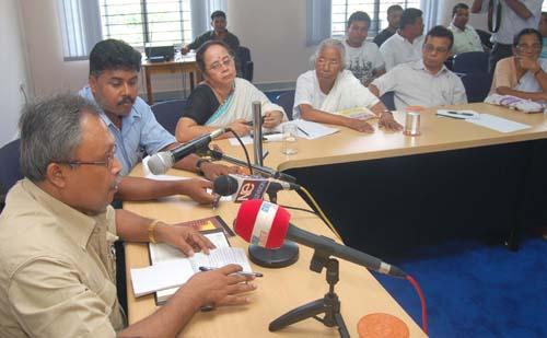 Leader of the Ceasefire Group of 28th Battalion of United Liberation Front of Assam Mrinal Hazarika addressing in a meeting at Guwahati on 18-07-08 organized by the Omeo Kumar Das Institute of Social Change and Development in presence of renowned journalists, literatures and others over the current development in the peace process of Assam. Pix by UB Photos.