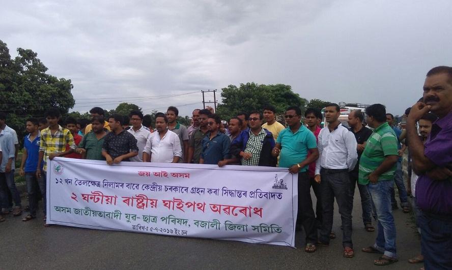 Hundreds of AJYCP leaders and activists on Tuesday blocked the National Highway in Bajali area in Barpeta district opposing the Centre’s move to auction 12 oilfields to the foreign companies. Led by AJYCP’s Bajali District Committee Secretary Pranjal Das many activists thronged the National Highway in the morning where they staged one hour long blockade paralyzing the movement of normal traffic till 12.30 noon.