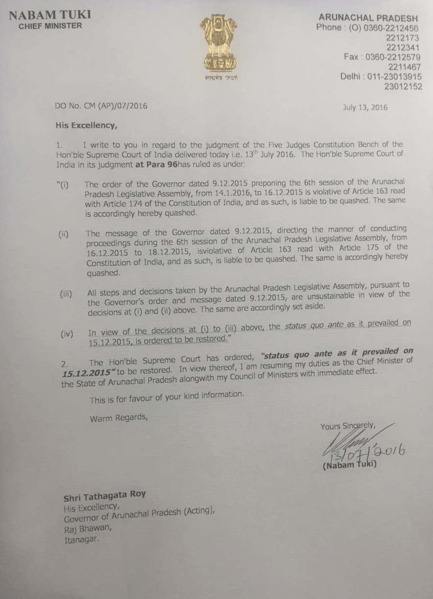 In a huge development in the country's political landscape, Nabam Tuki took charge again asArunachal Pradesh Chief Minister following Supreme Court's ruling on Wednesday making an end to the regime of Kelikho Pul.