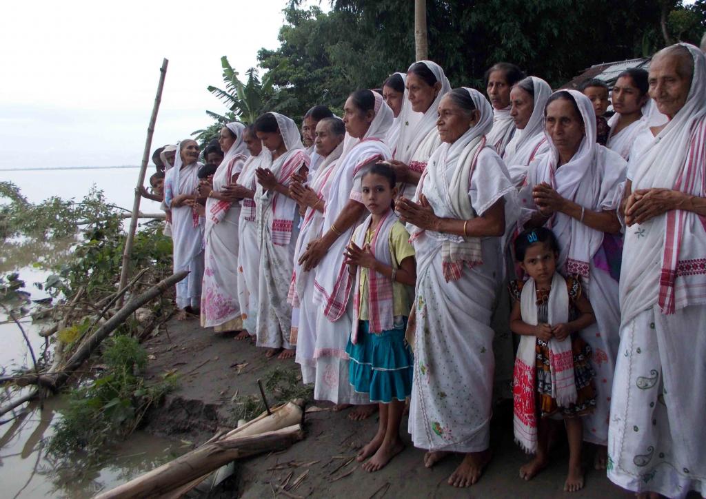 Fed up with human efforts, the local residents of Dakhinpat Kumargaon in Majuli praying with folding hands to the mighty Brahmaputra to exercise restraint. Massive erosion has been wreaking havoc in the entire area in the absence of proper initiative for years.