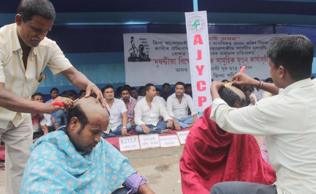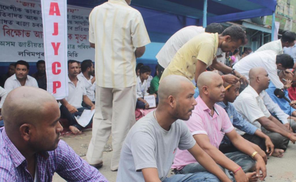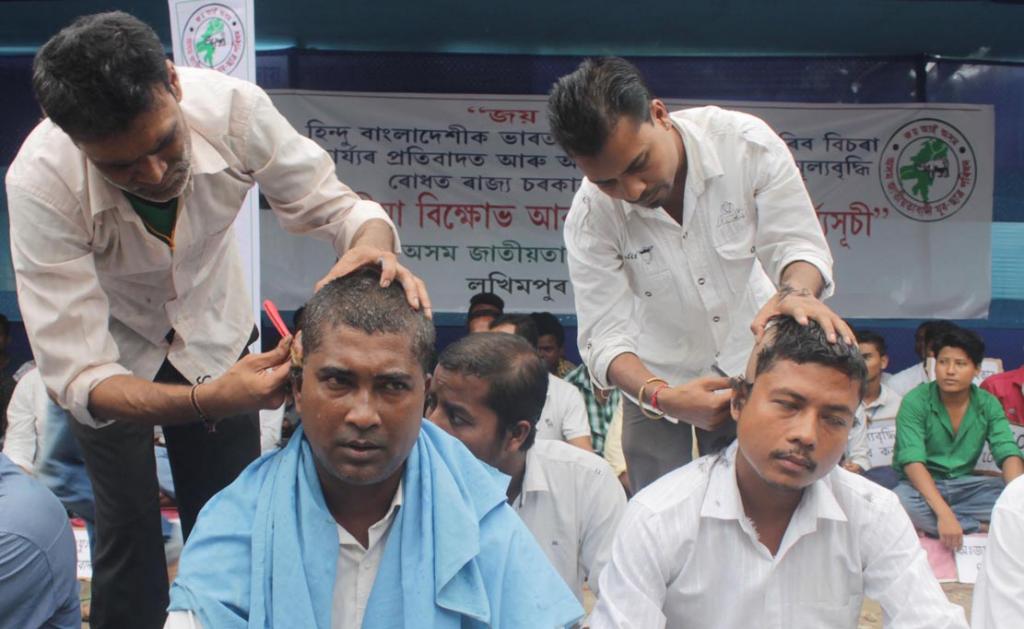 Asom Jatiyatabadi Yuba Chhatra Parishad (AJYCP) Lakhimpur district unit protested against Government's decision to give citizenship to Hindu Bangladeshi and on unabated price rise in the state by shaving off their heads on Thursday.