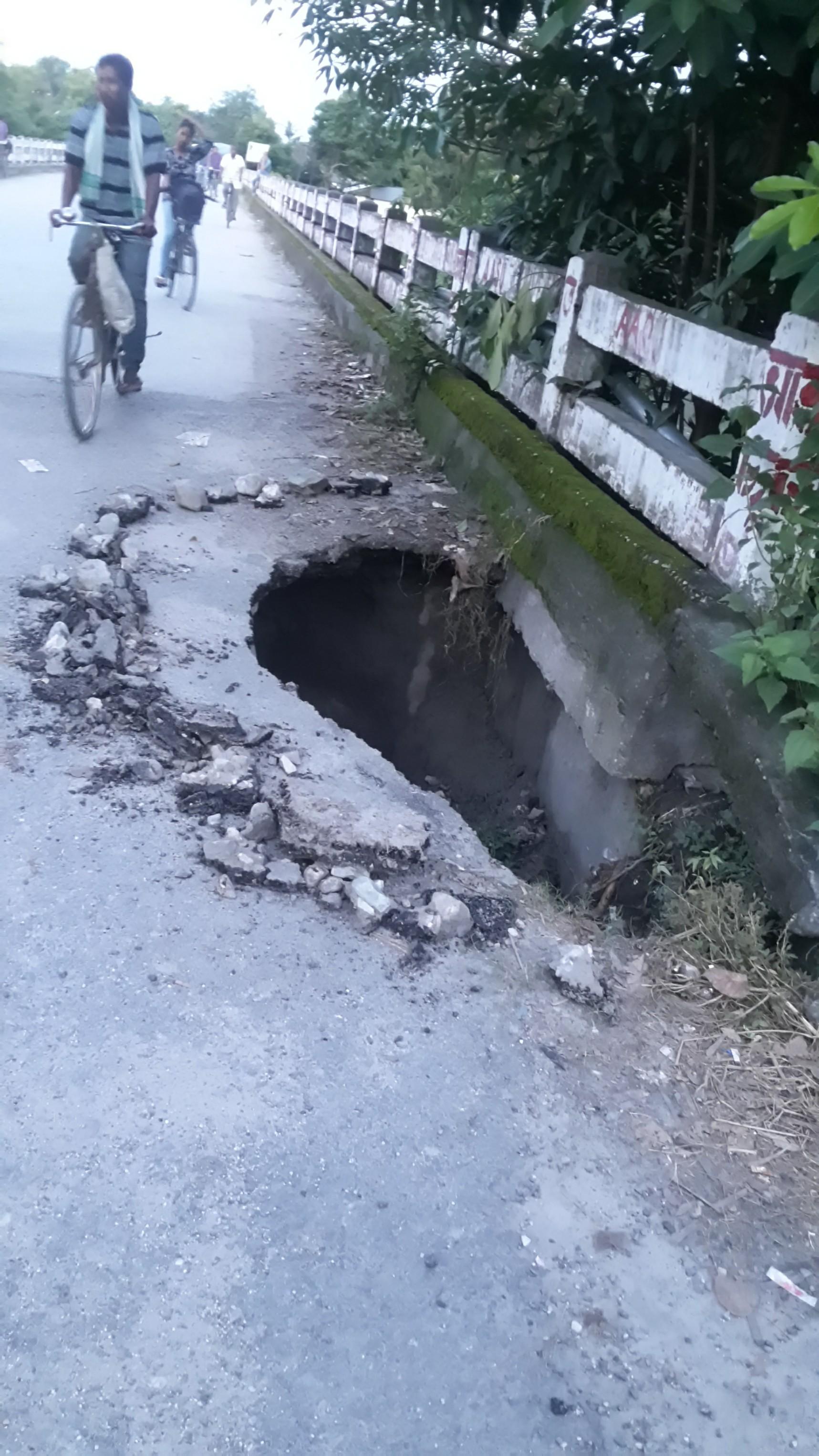 The emergence of a massive death trap in the important road bridge over Nonai river of Tanglaover the Tangla-Bhergaon road have raised concerns of the local populace of greater Tangla area. What is more shocking and bizzare is that even after two days of emergence of the death trap it has not even come to notice of PWD Road authorities making it more vulnerable to major accidents. "The death trap is lying naked posing serious threat without any warning signs or safety of commuters" said,Jitu Pathak a college student .