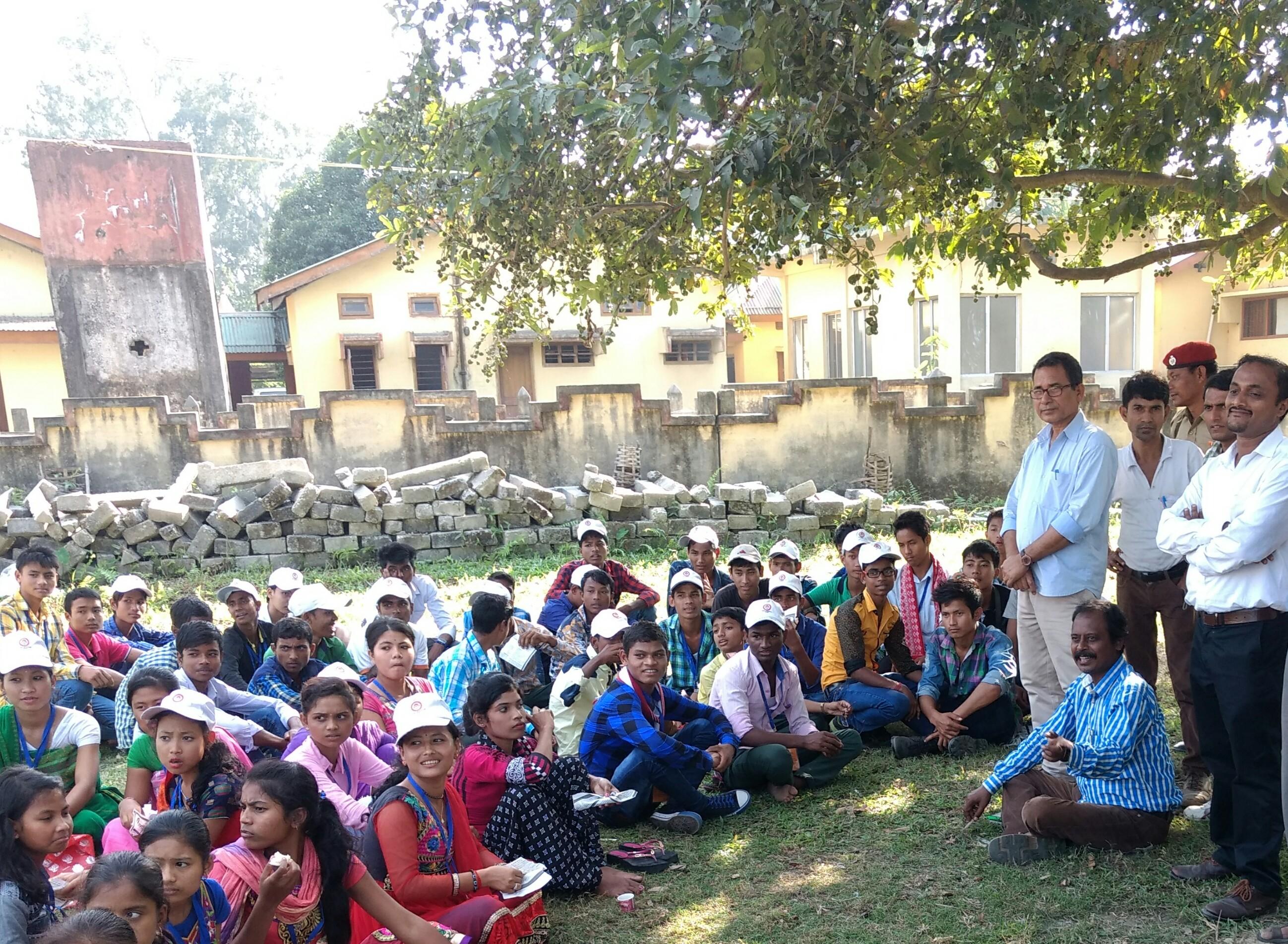 Photo shows DN Hazarika,ADC,Udalguri (sitting on ground )talking to students at Kalaigaon on November 12 at 1 pm