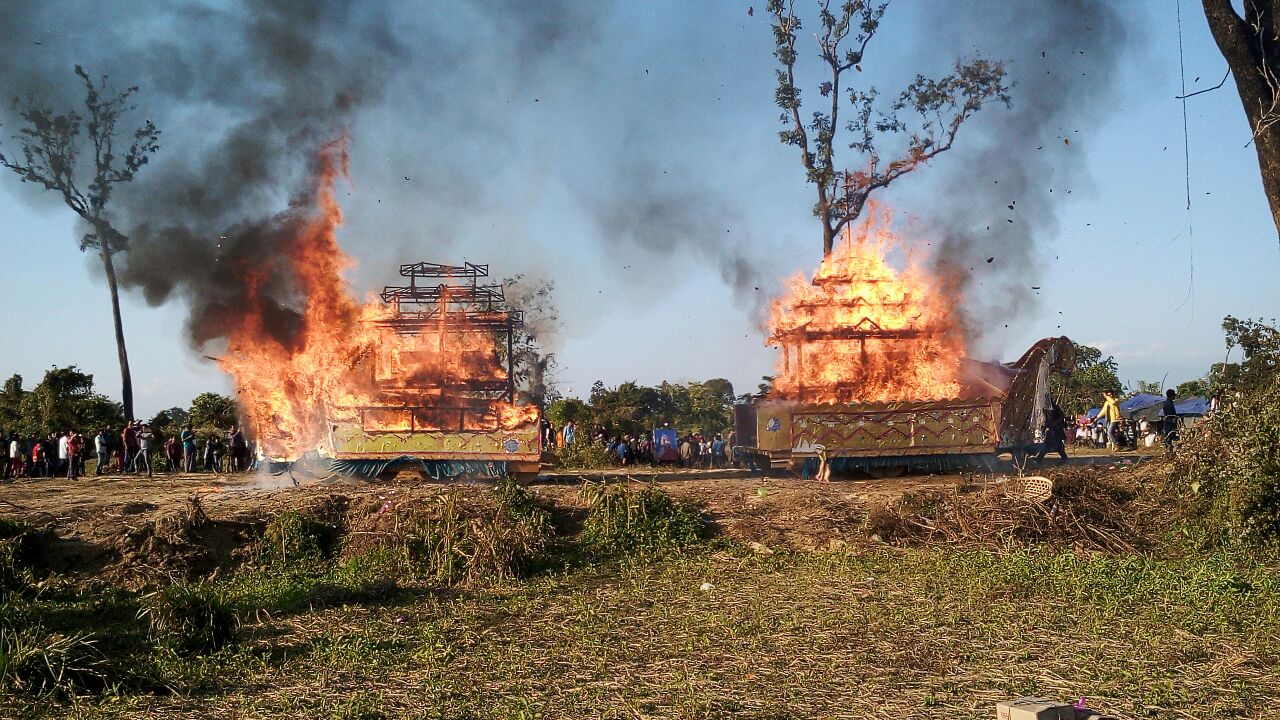The three-day grand Catafalque (Ceremonial chariot) festival known as Poi-Leng concluded on Saturday with burning of Ossuary (mortal remains) Ceremonial Chariot at Mahabodhi Lord Buddha College (MLBC) premises Namsai with great religious honour. Monks and devotees more than 3 lakhs from far and wide thronged the ground on day 1 to witness the installation of mortal remains and on day 3 pay their veneration during last rites performance and cremation of the two monks in the decorated ceremonial chariot.