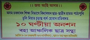 Hundreds of AASU activists in the district and subdivisional headquarters along with the block level are on a 100 hour hunger strike from Friday morning to mount pressure on the government to ensure immediate distribution of textbooks in all primary and high schools.