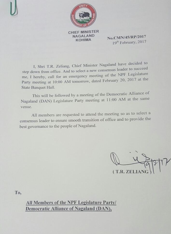 In a statement issued immediately after he arrived from Delhi, Zeliang convened an emergency meeting if the NPF legislative body meeting at the State Banquet Hall In Kohima at 10 in the morning.