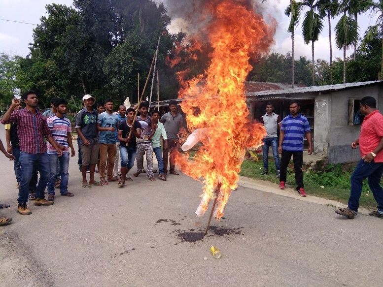Protesting education minister Dr Himanta Biswa Sarma's remarks over amalgamate policy of Assam High Madrasa Board with SEBA, the All BTC Minority Students Union burnt effigy of Dr Sarma at Salakati main Road in Kokrajhar district on Thursday.