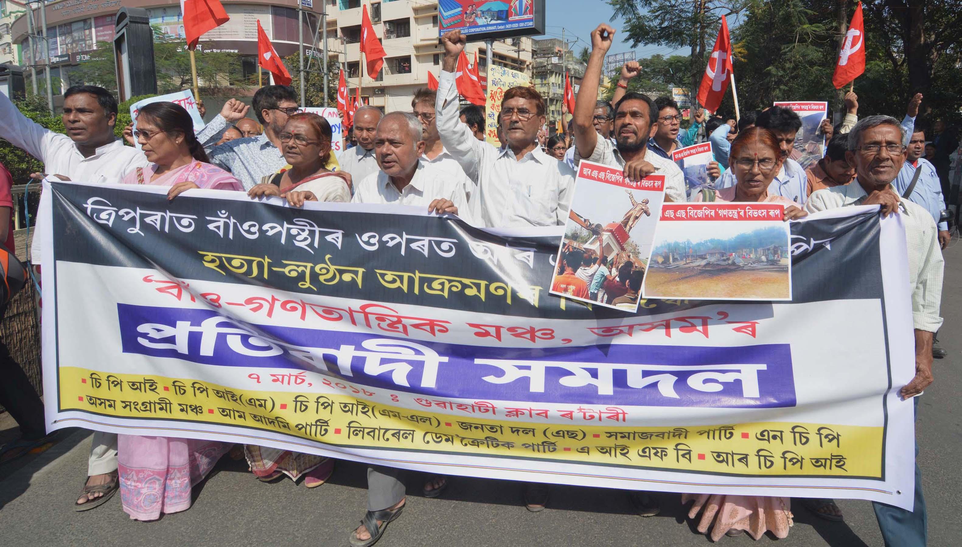 GUWAHATI: Hundreds of people joined a CPI sponsored procession in Guwahati streets on Wednesday in protest against the demolition of two Lenin statues in Tripura after BJP-IPFT alliance decimated the Left Front in the recent polls.