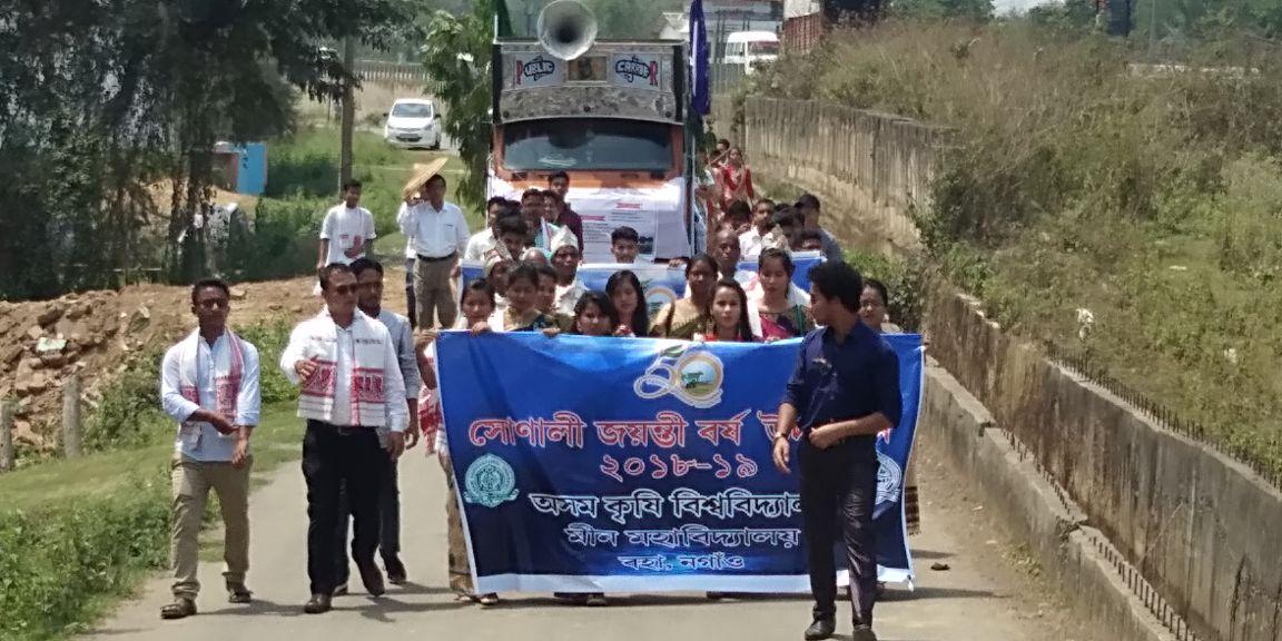 The Assam Agricultural University is celebrating its golden jubilee year with a year long celebration programme commencing from 1st April this year. As a part of this celebration , College of Fisheries , a constituent college of the university today took out a colourful cultural procession at Raha. More than 100 students , teaching and non-teaching staffs of the college headed by Dr. K. K Tamuli , Dean , College of Fisheries , Raha participated in the procession where the achievements of the university in the last 50 years was highlighted. In the cultural procession, bihu husori, biya naam, ai naam, jikir and jari, Assamese marriage, gayan-bayan, folk dances of various tribes of Assam and North-East were demonstrated which enthralled the audience.
