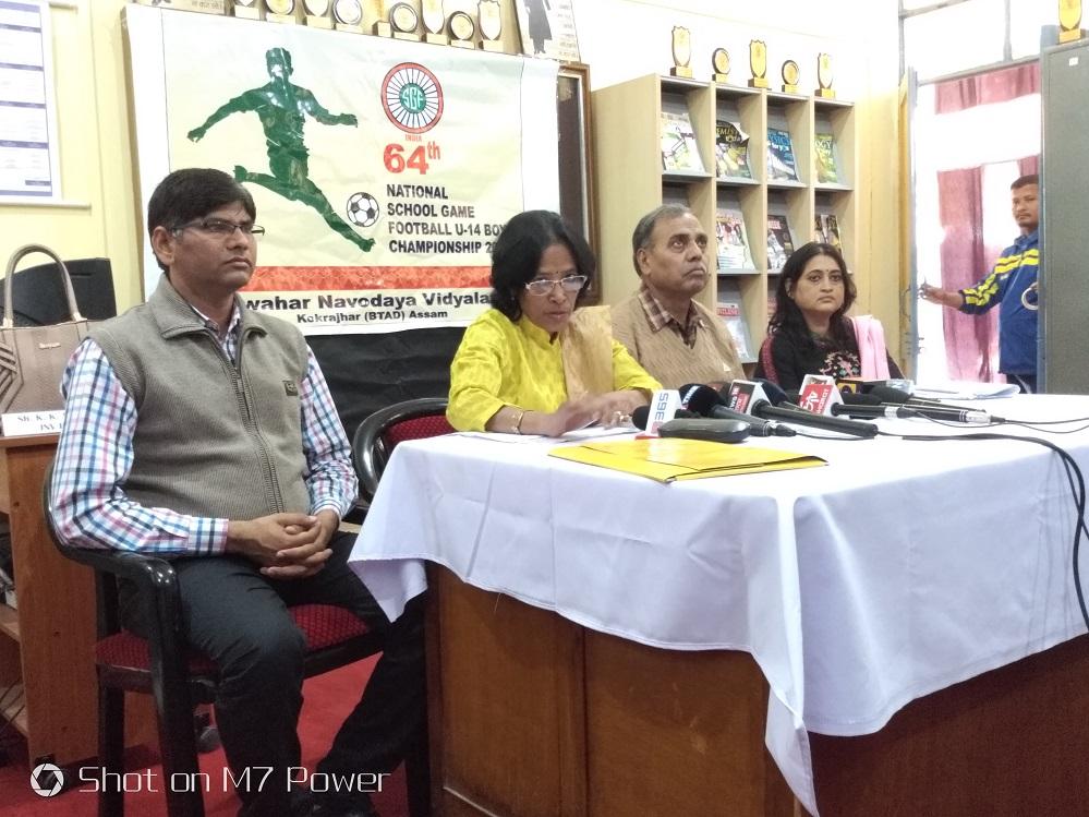 Speaking the reporters at a Press Conference held at JNV Ranchaidham on Sunday, Consultant of Navaday Vidyalaya Samiti(head quarter,Noida) Manikuntala Sarkar, Deputy Commissioner of Shillong Region JNV RK Gupta told that the school games will be organised with a scheduled manner. Sarkara said that necessary arrangements and preparations are over to accord warm welcome to the participants and officials of the event.She said that 29 referees and five extra officials from Assam fotball association have been deputed to meet healthy organise of the national event.