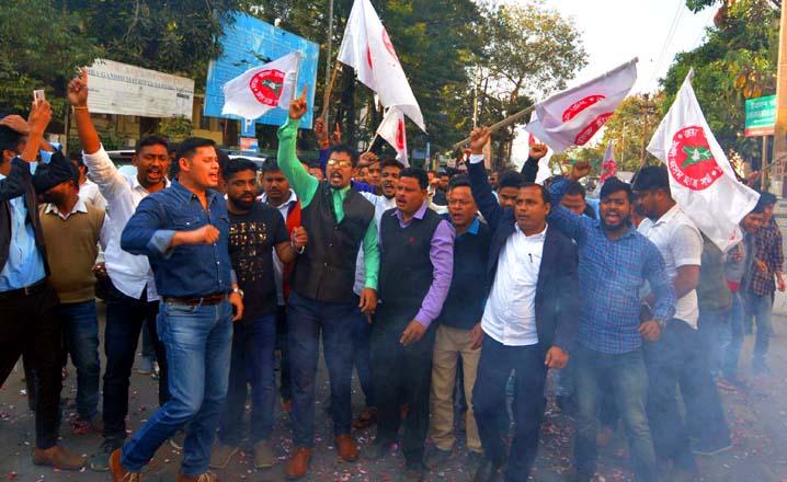 All Assam Students’ Union (AASU) celebrates after the BJP run central government failed to move the Citizenship (Amendment) Bill 2016 in Rajya Sabha on Wednesday.