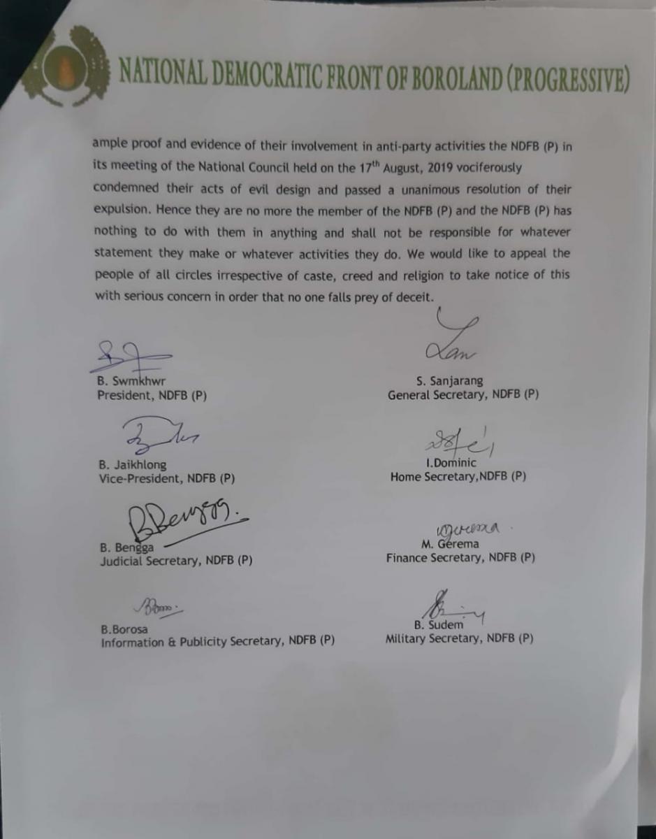 The NDFB (P), an armed outfit which has been on peace process with the Government announces the expulsion of Dhiren Boro @ B. Sungthagra, Advisor and Fresh Moshahary @ M. Fwilao, the Ex. CO. Eastern Zone, from the Primary membership of the NDFB (P) for their involvement in subversive activities to divide and destabilise the NDFB (P) and its allied organization both overtly and covertly for their ulterior motives.