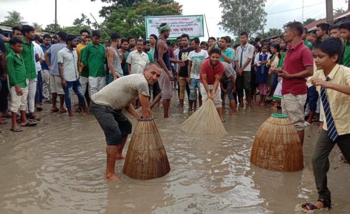 Agitated peoples come out with fishing net and started fishing on the road which was organized by All BTAD Minority Student's Union (ABMSU) to put pressure on government for early repairment of the road.