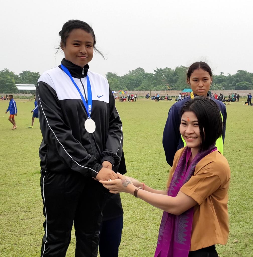 World Boxing Championships Bronze medalist Jamuna Boro distributing medals to the winners at the ongoing Inter District Junior Athletics Championship 2019 at Udalguri Stadium in Udalguri on Thursday.