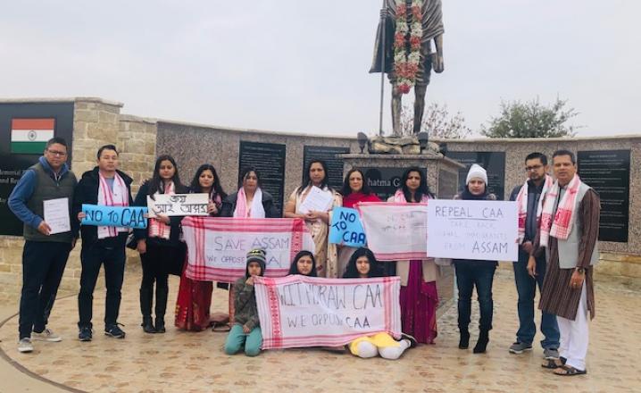 The event took place at the Mahatma Gandhi Memorial Plaza. The group gathered around the statue of Mahatma Gandhi holding placards and Assamese "Gamusa" calling for a withdrawal of the act.
