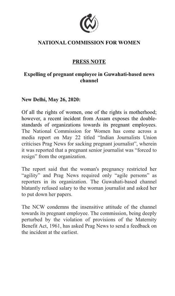 Days back, expressing deep shock and concern ‘at the manner in which Guwahati based journalist Ranjita Rabha was forced to resign from her position in Prag News’, the Network of Women in Media, India (NWMI) called upon the NCW and the State Commission for Women to take suo moto cognizance of the issue.