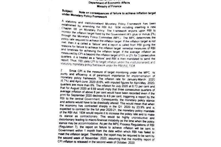 Finance ministry's note dated September 21, 2020, in which it made a case to give RBI exemption from MPC accountability norms