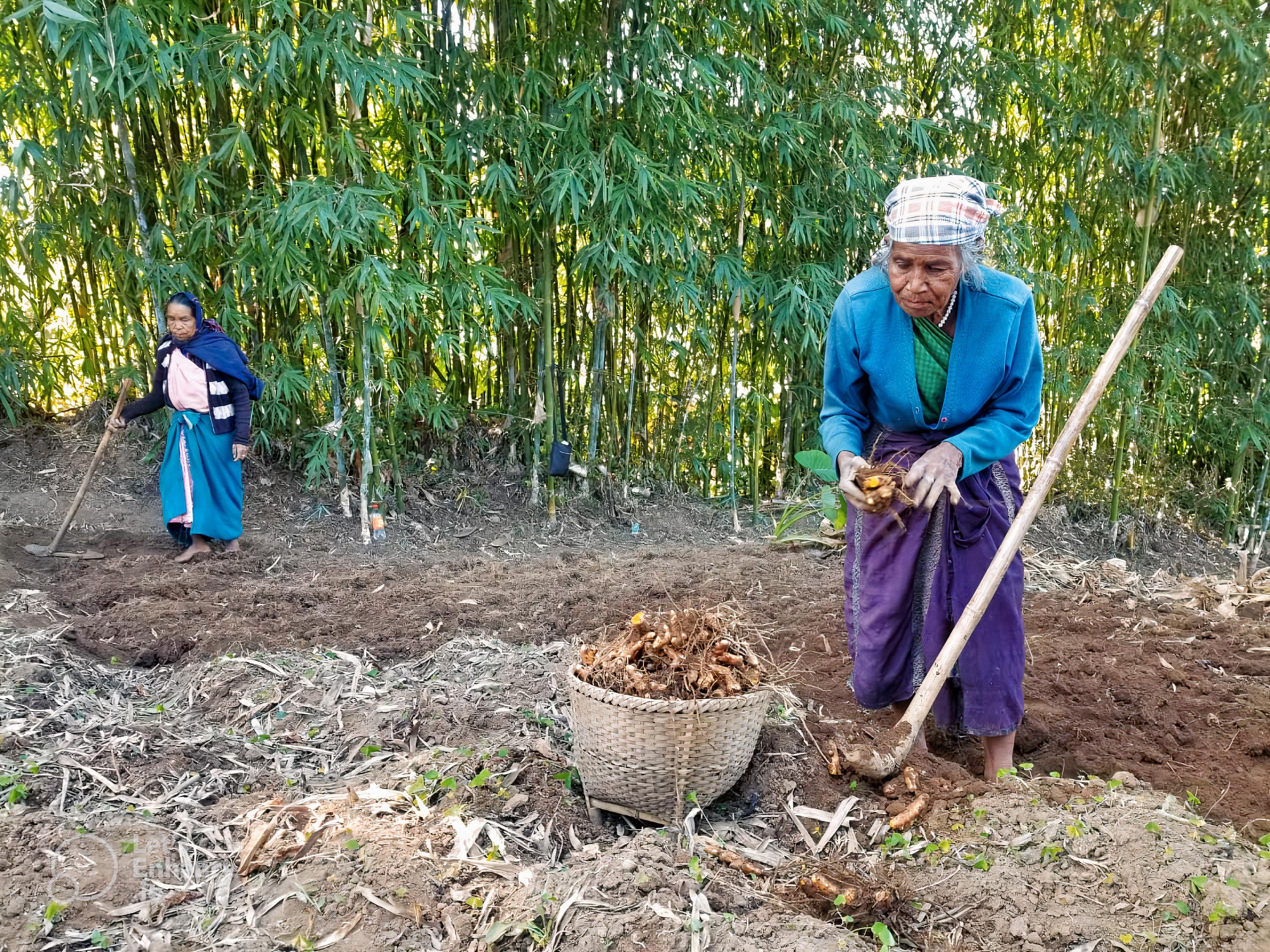 The process of cultivating Lakadong turmeric involves small land plots owned by the farmers, many of whom are single mothers or sole providers for their families. After the turmeric is dried, it is ground into powder using a small machine, although the process is time-consuming. The tribals collect honey from the forests, bringing it back to their homes to hang the honeycombs on their roofs. The honey drips down and is collected in cans, then taken to the social worker, who assists with packaging.