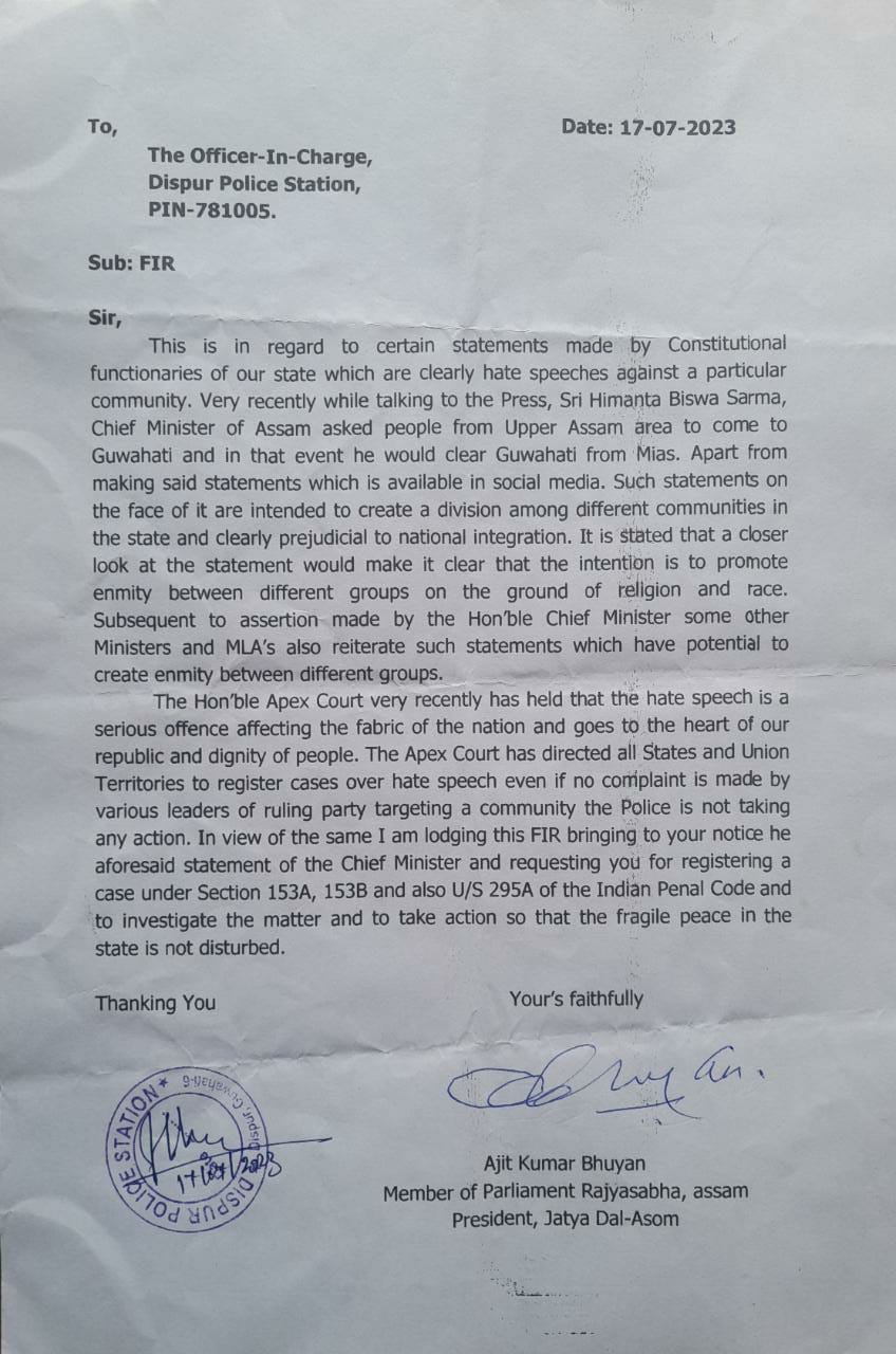 Ajit Kumar Bhuyan, a Member of Parliament in Rajya Sabha and the President of Jatiya Dal-Asom, has filed an FIR against Assam Chief Minister Himanta Biswa Sarma and several other ministers and MLAs. The FIR, addressed to the Officer-In-Charge of Dispur Police Station, alleges that the statements made by these constitutional functionaries constitute hate speeches against a particular community.
