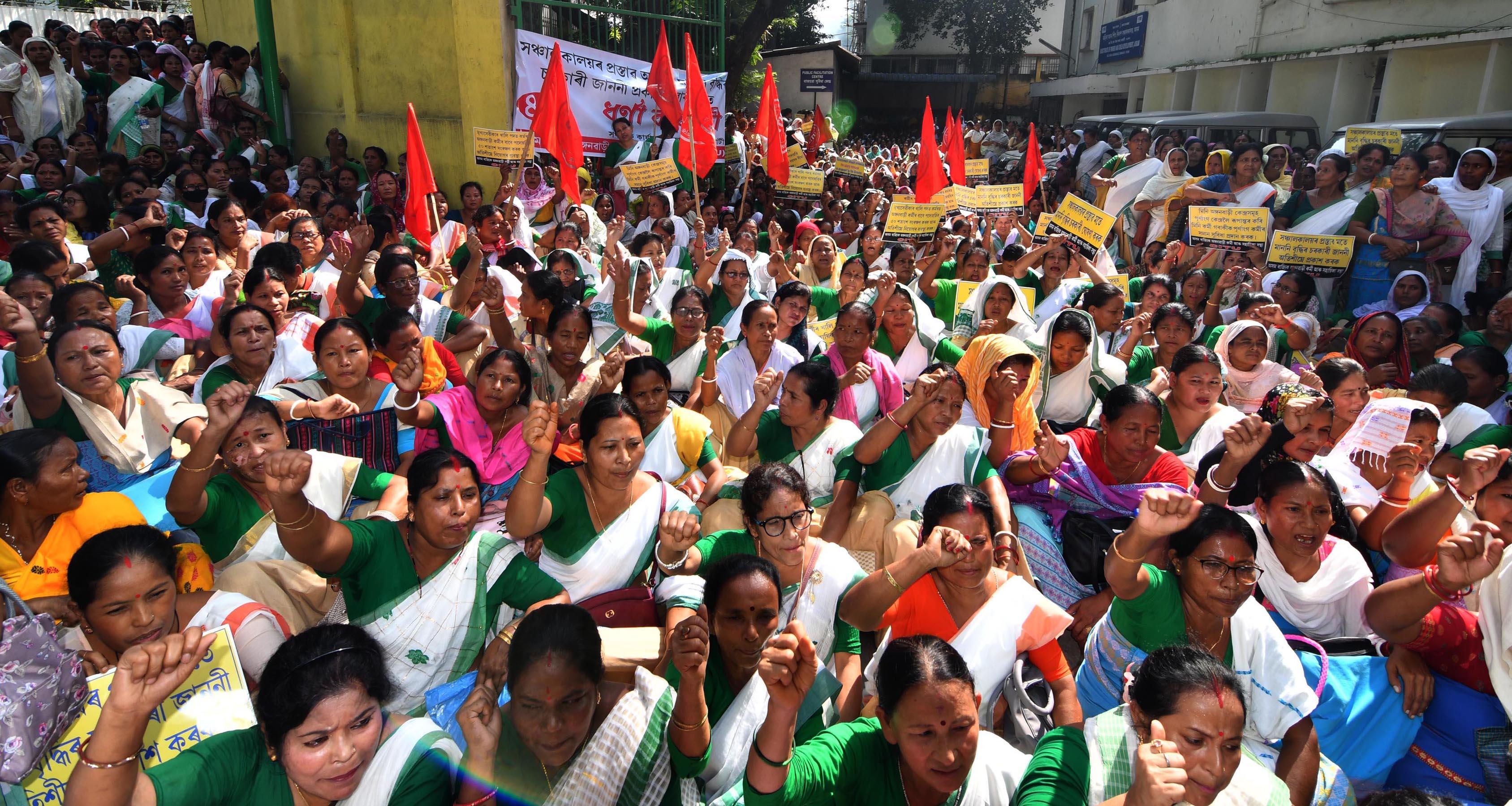 The Assam State Committee of Anganwadi Workers and Assistants Association (ASAWWA) staging a protest in front of the Directorate of the Women and Child Welfare Department in Ujan Bazar, Guwahati on November 4. The protesters demanded the government publish the official notice regarding a proposed salary increase for Anganwadi workers and assistants. The association is advocating for transparency and timely communication regarding the salary adjustments, which are crucial for the livelihood of its members. The protest underscores the ongoing struggles faced by Anganwadi workers in securing fair compensation for their vital contributions to community health and education.