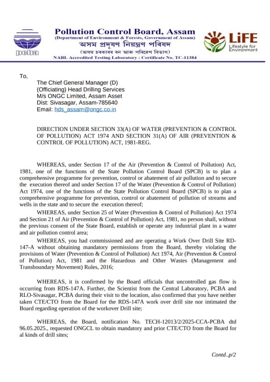 Speaking to this writer, PCBA chairman Er Arup Kr Mishra informed that the responsible board officials had confirmed the uncontrolled gas flow from RDS-147A causing pollution to the local environment. The visiting scientists from the PCBA’s central laboratory and RLO- Sivasagar to the location detected that the ONGC authority had neither taken CTE/CTO for the RDS-147A work over drill site nor even intimated the board, stated Mishra, adding that the ONGC Limited, Assam Asset was intimated with various provisions under the Air (Prevention & Control of Pollution) Act 1981, the Water (Prevention & Control of Pollution) Act 1974, the Hazardous and Other Wastes (Management and Transboundary Movement) Rules 2016, and the Environment (Protection) Act 1986, which were violated while operating a ‘Work Over Drill Site RD147-A’.