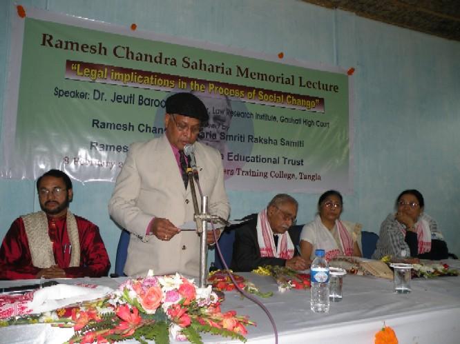 Ramesh Chandra Saharia Education Trust organised a lecture titled “Legal implications in the process of social change” recently at Ramesh Chandra Saharia Teachers Training College,Tangla on February 8.It was a part of a series of lectures organised each year in memory of late RC Saharia,former Home Minister of Assam,who also served as the headmaster of Tangla High School prior to 19972. Mridula Saharia,wife of late RC Saharia and former chairperson of state Woman Commission delivered the opening speech before offering floral tribute to the image of late Saharia. Thaneswar Malakar,noted writer and DC,Udalguri district inaugurated the memorial lecture. On the occasion he thanked RC Saharia Education Trust for organising the lecture series in a classic manner to keep alive memory of late RC Saharia.With special reference to legal awareness programme,Malakar said that knowledge about must be made available to common people. Noted literate and educationalist Bhadra Bora in his speech as the chairperson, remarked that smell of flowers spread at the direction of wind where as good works of a man spread to all directions. The programme was also addressed by Kamali Basumatari,MLA,Paneri LAC;Dr.Jeuti Barooah,Director Law Research Institute,Guwahati High Court and Md.Unus,Commissioner cum Secretary,Health etc Assam.